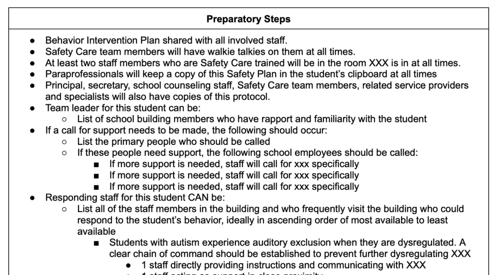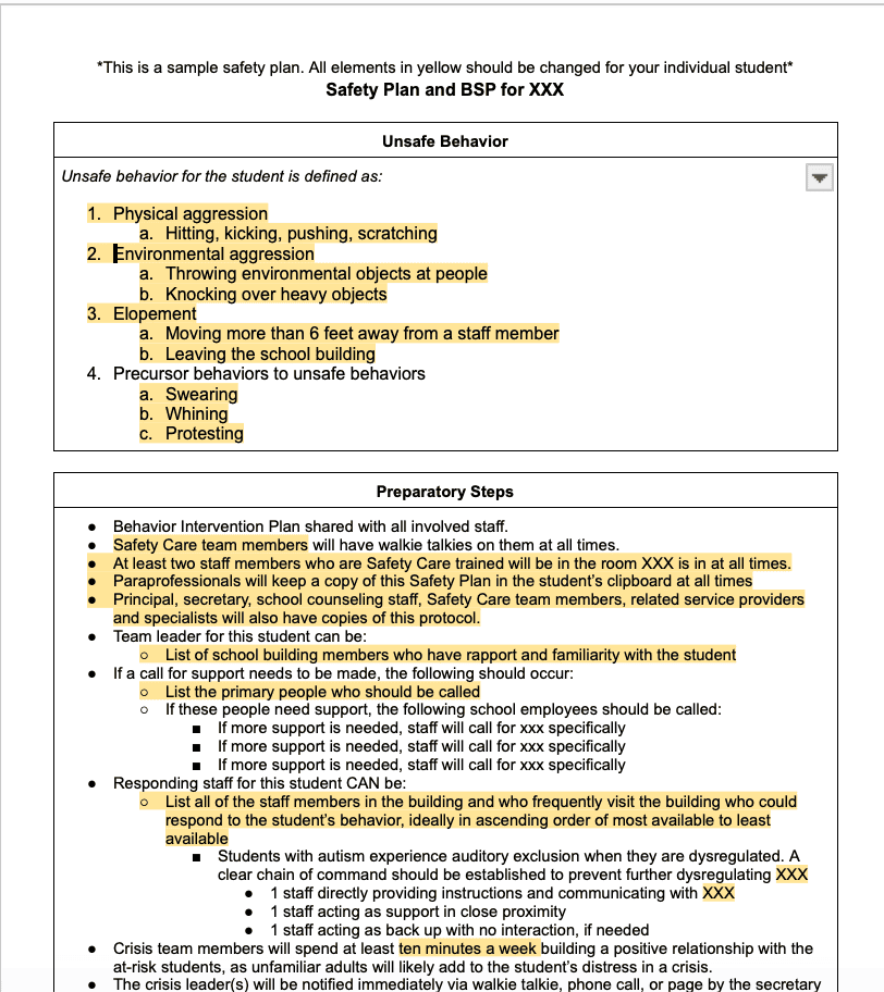 These plans are often used alongside a Behavior Intervention Plan (BIP), especially for students with intensive behavioral needs. The safety plan is typically more thorough and does not include a summary of the behavioral evaluation that was conducted. These are more practical, easy to follow, and take the guess work out of what to do when challenging behavior occurs.