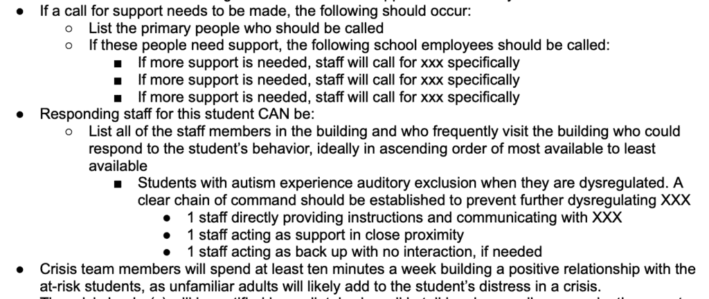 For some students (e.g., those with anxiety or PDA profiles), language matters significantly. Declarative, low-demand communication can reduce escalation and this should be included in your behavior safety plan. Even going as far as to provide sample scripts that staff should use can be extremely helpful.