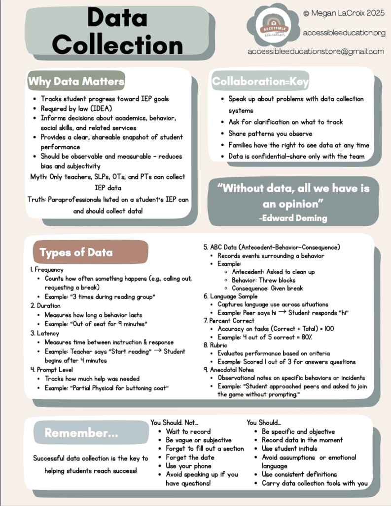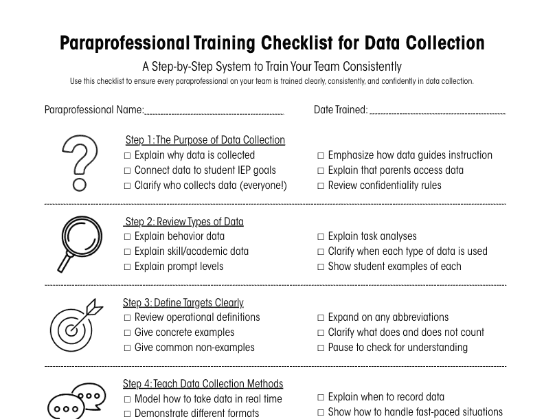 Training paraprofessionals is a huge part of your job as a special education teacher, so you already know this truth: Data collection doesn’t work unless your whole team is on board. You can design the most beautiful data sheets, align everything to IEP goals, and have a perfectly organized binder—but if your paraprofessionals aren’t confident in how to take data (or why it matters), it quickly falls apart. And to be fair, most paraprofessionals were never formally trained to do this!